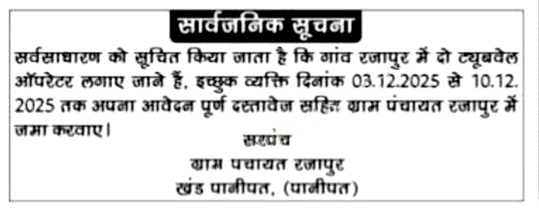 ग्राम पंचायत रजापुर ब्लॉक पानीपत में दो ट्यूबल ऑपरेटर भर्ती का नोटिफिकेशन जारी कर दिया गया है. यह भर्ती बिना किसी लिखित परीक्षा के आयोजित कराई जा रही है. इच्छुक उम्मीदवार इस भर्ती के लिए ऑफलाइन आवेदन 10 दिसंबर 2025 से पहले कर सकते हैं. इस भर्ती से संबंधित नोटिफिकेशन और आवेदन फार्म नीचे दे दिया गया है.